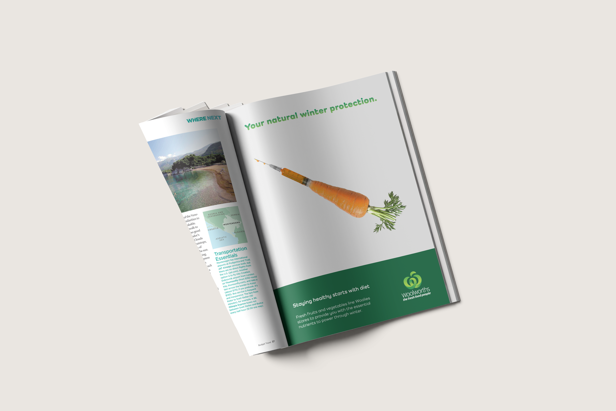 Woolworths wanted to position itself as the place to go for fresh fruits and vegetables so people could combat illness and stay healthy throughout the winter. With a heightened awareness due to recent viruses circulating at an increased rate, Woolworths wanted a magazine ad to remind people that Woolworths is where you can get all you need for a healthy diet.